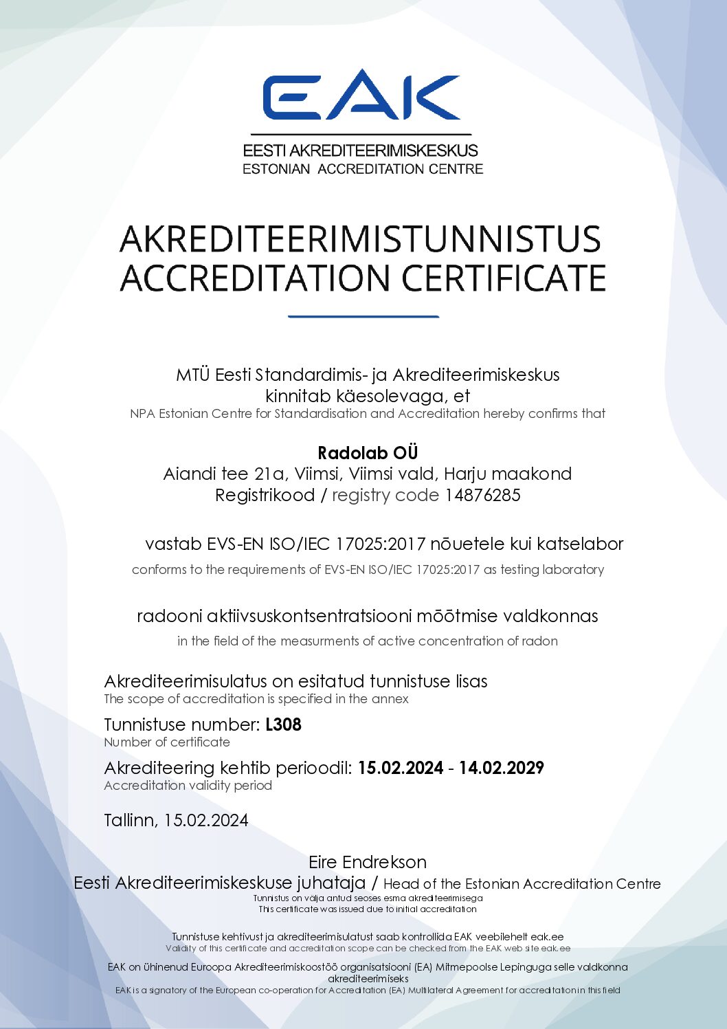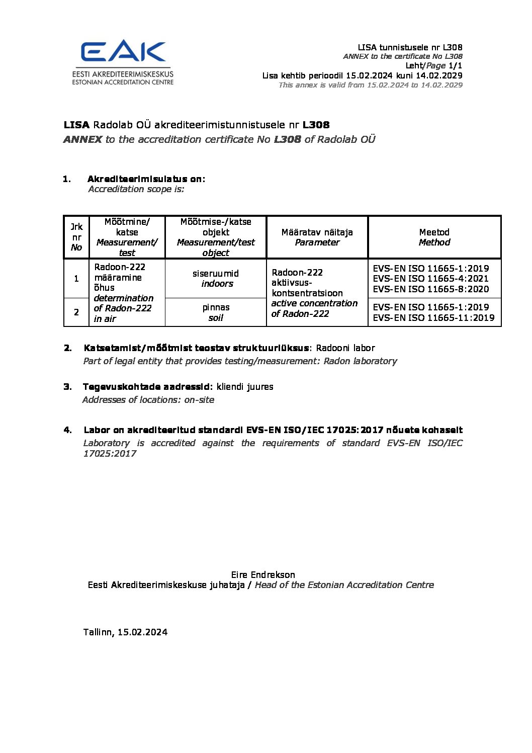 Akrediteerimisulatus siseruumides ja maapinnast mõõtmisel: EVS-EN ISO 11665-1:2019; EVS-EN ISO 11665-4:2021; EVS-EN ISO 11665-8:2020; EVS-EN ISO 11665-1:2019; EVS-EN ISO 11665-11:2019